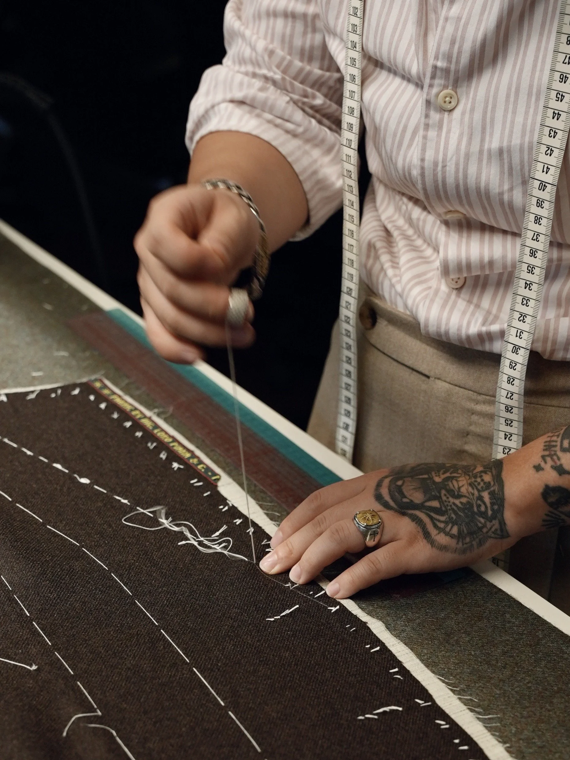 Depending on the garment, we may proceed directly into tailoring or, for more structured pieces like jackets and suits, we may recommend a trial garment or basted fitting sent to you. This allows us to adjust the fit and refine the balance before final production.