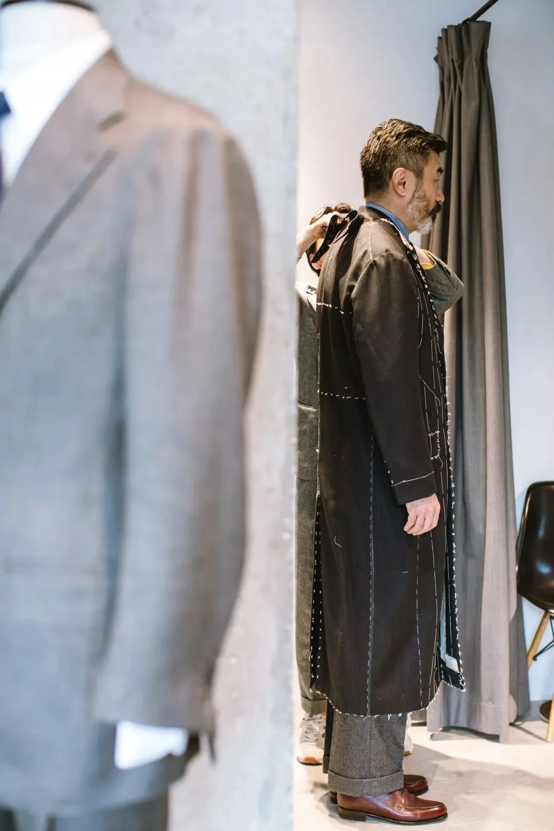 “I like a soft structure, no shoulder pads. I also like to extend the shoulder lines a little bit, took the inspiration from the senior people I saw in Europe. Their suits all look very comfortable and a bit loose."