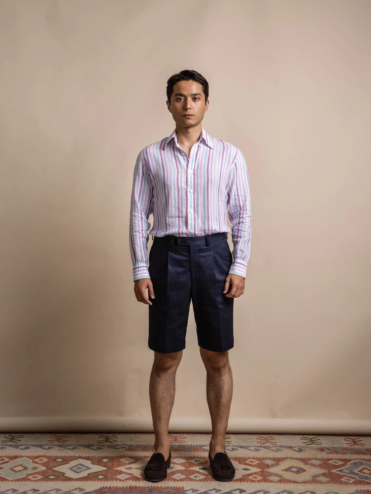 Our shorts are made with a mid-rise, meant to sit at your natural waist, which visually elongates your legs and proportions and the single pleat creates a sharp, slimming silhouette. They fit relaxed in the hips and thigh with a slight taper through the cuff.